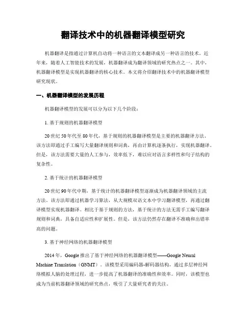 一、机器翻译模型的发展历程机器翻译模型的发展可以分为以下几个阶段:1. 基于规则的机器翻译模型20世纪50年代至80年代,基于规则的机器翻译模型是主要的机器翻译方法。