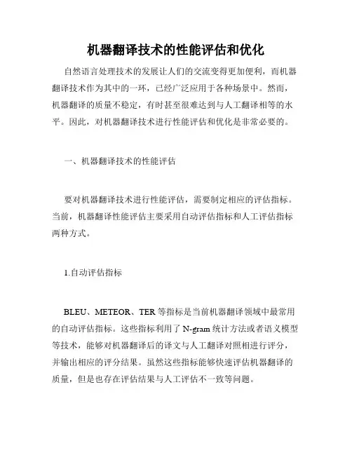 二、机器翻译模型的优化方法为进一步提高机器翻译模型的准确性和效率,研究者们还探索出了多种机器翻译模型的优化方法,包括:1. 集成学习集成学习即将多个不同的机器翻译模型进行融合,以提高最终翻译结果的准确性。