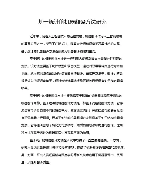 2. 基于统计的机器翻译模型20世纪90年代中期,基于统计的机器翻译模型逐渐成为机器翻译领域的主流方法。