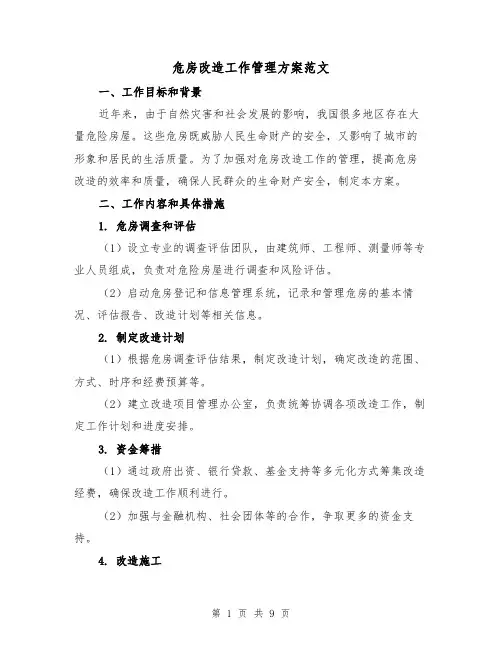 危房改造工作管理方案范文一、工作目标和背景近年来,由于自然灾害和社会发展的影响,我国很多地区存在大量危险房屋。