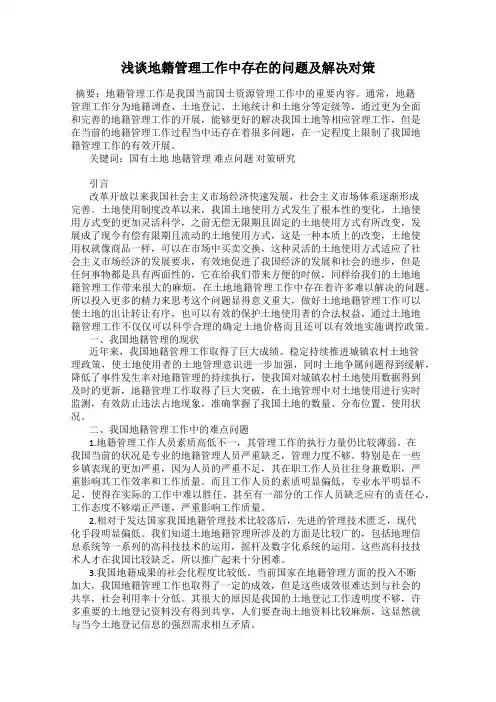 2、地籍管理工作中存在的问题2.1地籍管理工作相对滞后在当前社会和经济快速发展过程中,国家的各项发展政策也会随着社会和经济的发展而进行不断的调整,而地籍管理作为土地管理的基础,需要根据不同时期国家土地管理体制的变化而变化。