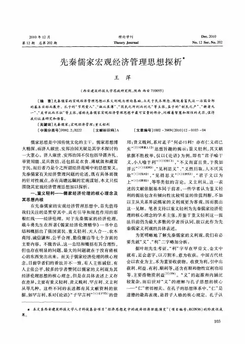 儒家重7 儒家经济思想及其特点8孔子研究 2000年第6期 义轻利的思想,就被理所当然地理解为重伦理的约束,而轻财利的创造。