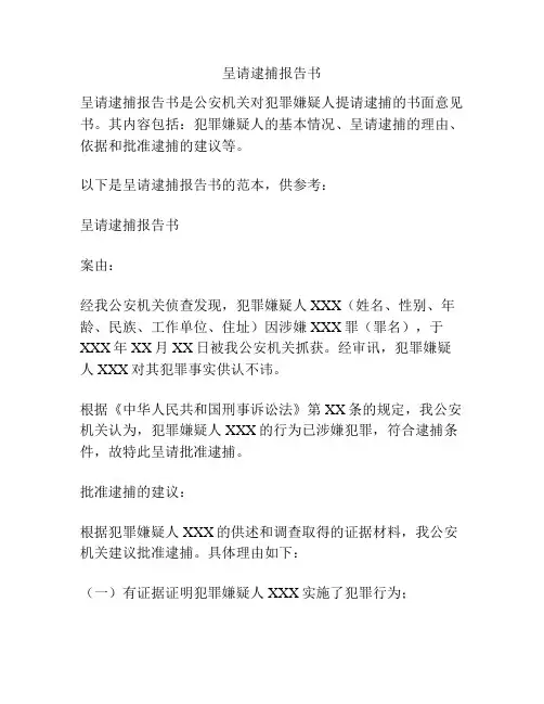 根据《中华人民共和国刑事诉讼法》第XX条的规定,我公安机关认为,犯罪嫌疑人XXX的行为已涉嫌犯罪,符合逮捕条件,故特此呈请批准逮捕。