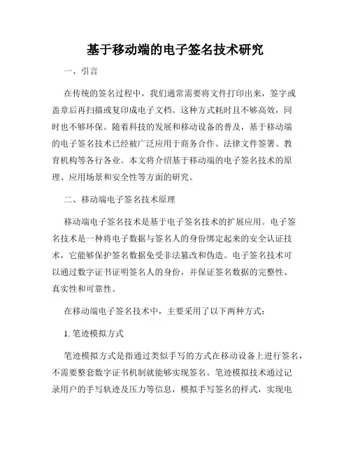 基于移动端的电子签名技术研究一、引言在传统的签名过程中,我们通常需要将文件打印出来,签字或盖章后再扫描或复印成电子文档。