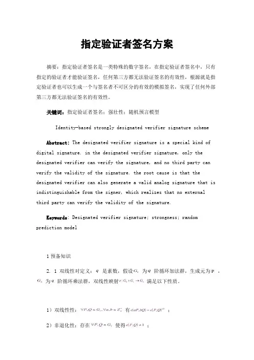 关键词:指定验证者签名;强壮性;随机预言模型Identity-based strongly designated verifier signature schemeAbstract: The designated verifier signature is a special kind of digital signature. in the designated verifier signature, only the designated verifier can verify the signature, and no third party can verify the validity of the signature. the root cause is that the designated verifier can also generate a valid analog signature that is indistinguishable from the signer, which realizes that no externalthird party can verify the validity of the signature.Keywords: Designated verifier signature; strongness; random prediction model1预备知识2. 1双线性对定义:是素数,假设为阶循环加法群,生成元为,为阶循环乘法群,双线性映射满足以下性质。