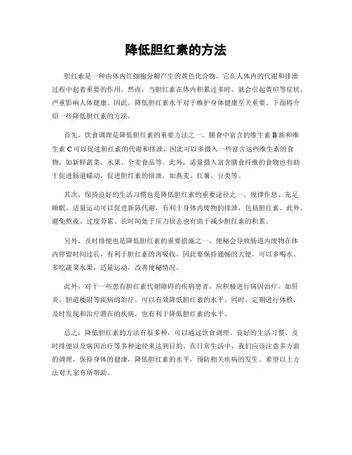 总之,降低胆红素的方法有很多种,可以通过饮食调理、良好的生活习惯、及