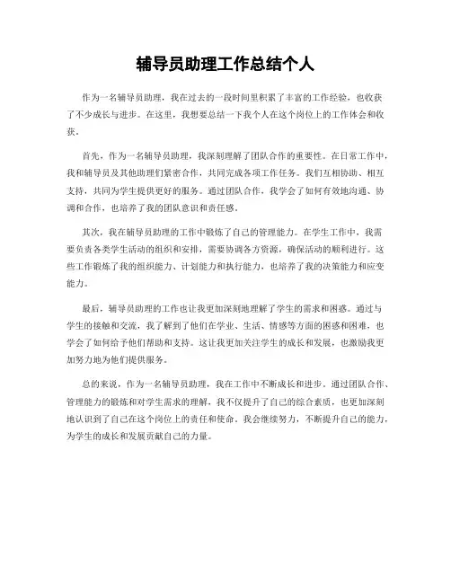 三、收获与不足在大学生辅导员助理工作中,我获得了许多宝贵的经验和收获,让我对大学学生的教育和成长有了更深入的了解。