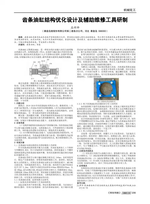 机械化工齿条油缸结构优化设计及辅助维修工具研制孟祥帅(秦皇岛港股份有限公司第二港务分公司,河北 秦皇岛 066000)摘要:齿条油缸是拨车机液压系统中重要的执行元件,将直线往复输入转化为旋转输出,用以牵引实现拨车机主臂及辅臂伸缩动作,当出现油封老化、液压油外泄、压力不足等故障问题后,需整体更换,费时费力。