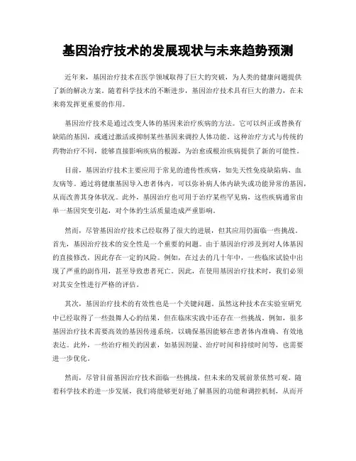 基因治疗技术的发展现状与未来趋势预测近年来,基因治疗技术在医学领域取得了巨大的突破,为人类的健康问题提供了新的解决方案。