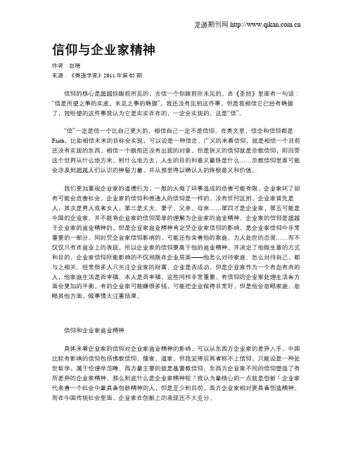 信仰与企业家精神作者:赵晓来源:《管理学家》2011年第05期信仰的核心是超越你眼前所见的,去信一个你眼前所未见的。