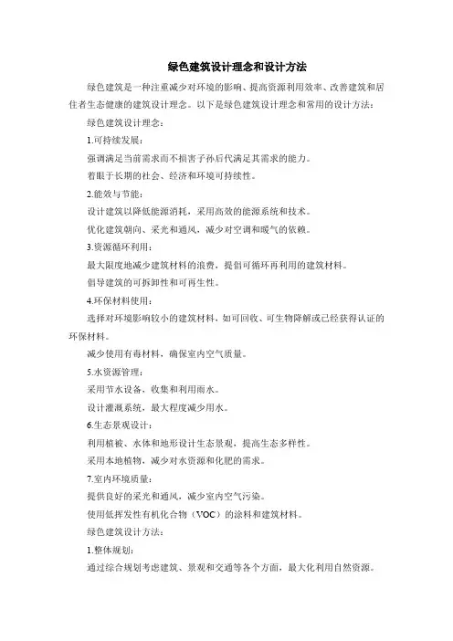 1.1 绿色建筑理念绿色建筑是一种以节能、节水、环保、健康为设计理念的建筑形式,它不仅仅是一栋建筑的表面形象,更是对建筑能源、材料、环境等多方面的要求。