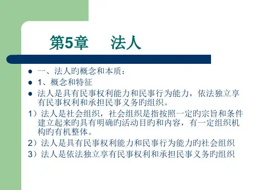「法人的特征」1.法人是组织(团体)2.法人拥有独立的财产3.法人能独立承担民事责任4.法人能以自己的名义参加民事法律关系【小结】法人与其成员在三个方面各自独立:人格独立、财产独立、责任独立。