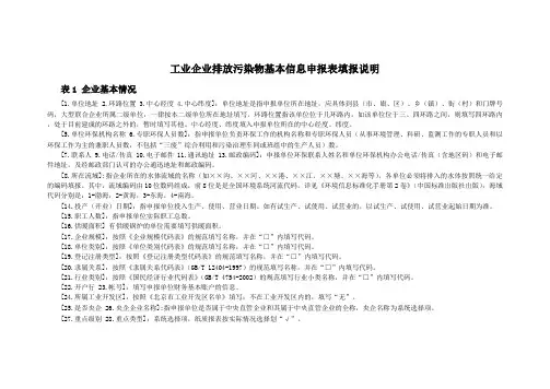 2、填报主要原辅材料名称指标时,要包含所有使用的有机溶剂类原辅材料.表1—4上年VOCs污染产生及排放情况表实际填写如没有画斜线表1-5上年单位产品排污量实际填写如没有画斜线表1-6上年能源消耗情况实际填写如没有画斜线表内指标关系:2=3+4,6=7+8+9表1—7上年用水情况(单位:万吨)注意单位表内指标关系:2=3+9+11,3=4+5+6+7,10=(9÷2)×100%表1—8上年污水及污染物排放汇总情况实际填写(生产和生活用水)如没有写无或者画斜线表内指标关系:2=3+4=5+6+7+9,7≥8,13≥14,15=16+17,9=10+11,15≥18表1—8附表上年污水一类污染物排放情况表1-9上年废气及污染物排放汇总情况表1-10上年固体废物产生及去向情况(单位:吨) 对照危废转移联单填写表1-10—附表上年危险废物产生及去向详细情况(单位:吨/年) 对照危废转移联单填写表内指标关系:3=5+9+13+15, 5=6+7, 9=10+11,14≥18备注:按照《国家危险废物名录》,医疗废物包括医院临床废物、医药废物和废药物/药品三类。