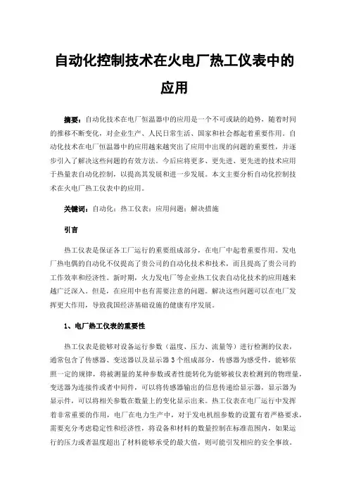 关键词:自动化;热工仪表;应用问题;解决措施引言热工仪表是保证各工厂运行的重要组成部分,在电厂中起着重要作用。