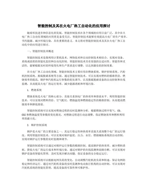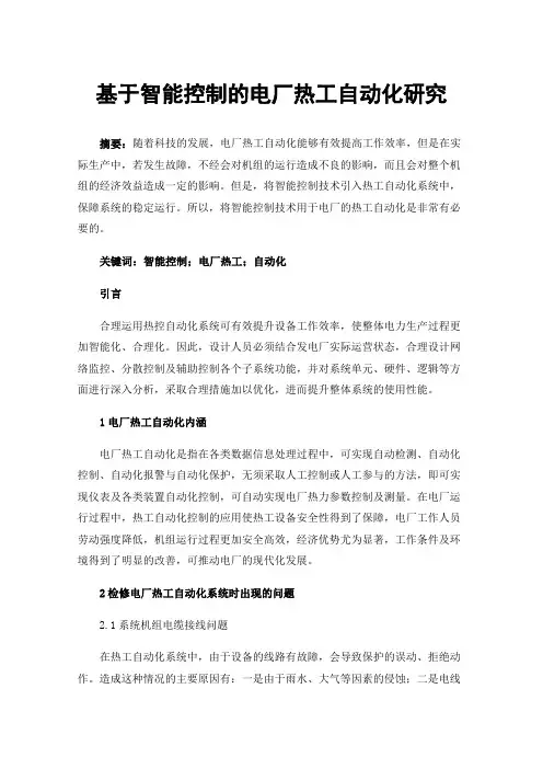 关键词:智能控制;电厂热工;自动化引言合理运用热控自动化系统可有效提升设备工作效率,使整体电力生产过程更加智能化、合理化。