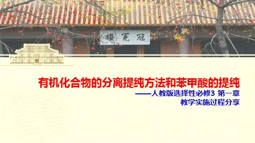 3、在操作过程中如何才能更好地控制饱和溶液和玻璃漏斗的温度实验四、苯甲酸的重结晶一、实验目的1、了解有机物重结晶提纯的原理和应用。