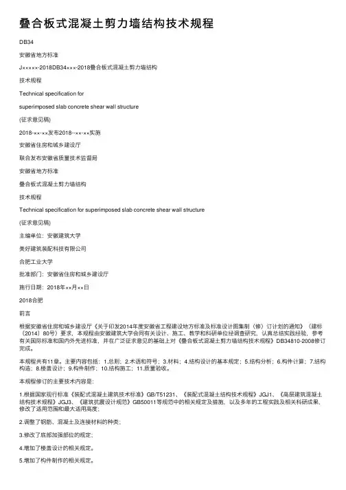 叠合板式混凝⼟剪⼒墙结构技术规程DB34安徽省地⽅标准J×××××-2018DB34×××-2018叠合板式混凝⼟剪⼒墙结构技术规程Technical specification forsuperimposed slab concrete shear wall structure(征求意见稿)2018-××-××发布2018--××-××实施安徽省住房和城乡建设厅联合发布安徽省质量技术监督局安徽省地⽅标准叠合板式混凝⼟剪⼒墙结构技术规程Technical specification for superimposed slab concrete shear wall structure(征求意见稿)主编单位:安徽建筑⼤学美好建筑装配科技有限公司合肥⼯业⼤学批准部门:安徽省住房和城乡建设厅施⾏⽇期:2018年××⽉××⽇2018合肥前⾔根据安徽省住房和城乡建设厅《关于印发2014年度安徽省⼯程建设地⽅标准及标准设计图集制(修)订计划的通知》(建标〔2014〕80号)要求,本规程由安徽建筑⼤学会同有关设计、施⼯、教学和科研单位经调查研究,认真总结实践经验,参考有关国际标准和国内外先进标准,并在⼴泛征求意见的基础上对《叠合板式混凝⼟剪⼒墙结构技术规程》DB34810-2008修订完成。