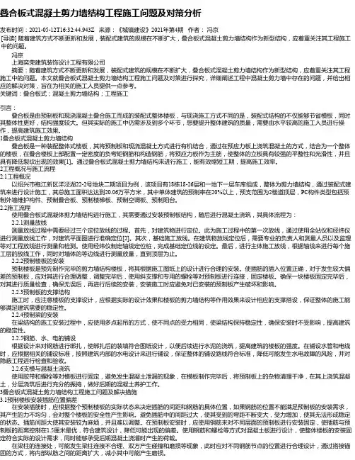 叠合板式混凝土剪力墙结构工程施工问题及对策分析发布时间:2021-05-12T16:32:44.943Z 来源:《城镇建设》2021年第4期作者:冯京[导读] 随着建筑方式不断更新和发展,装配式建筑的规模在不断扩大,叠合板式混凝土剪力墙结构作为新型结构,应着重关注其工程施工中的问题。