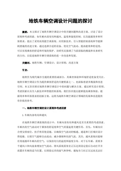 关键词:地铁车辆;空调设计;设计原则;改进方案引言:地铁作为现代城市交通的重要组成部分,其乘坐体验和环境舒适度备受关注。