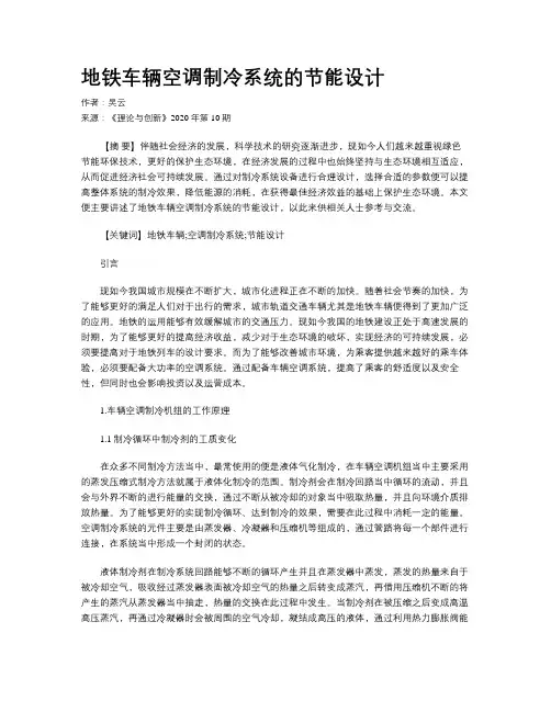 【关键词】地铁车辆;空调制冷系统;节能设计引言现如今我国城市规模在不断扩大,城市化进程正在不断的加快。