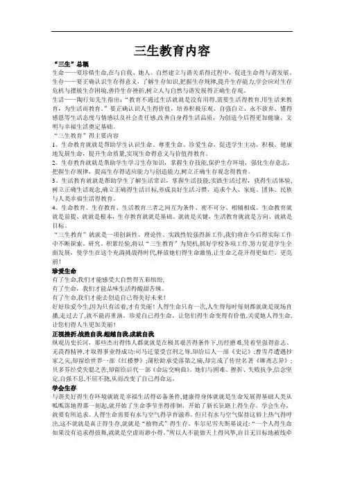 三生教育内容“三生”总概生命——要珍惜生命,在与自我、她人、自然建立与谐关系得过程中,促进生命得与谐发展。