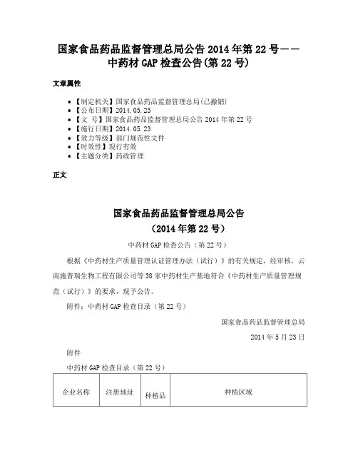 中药材GAP检查公告(第22号)