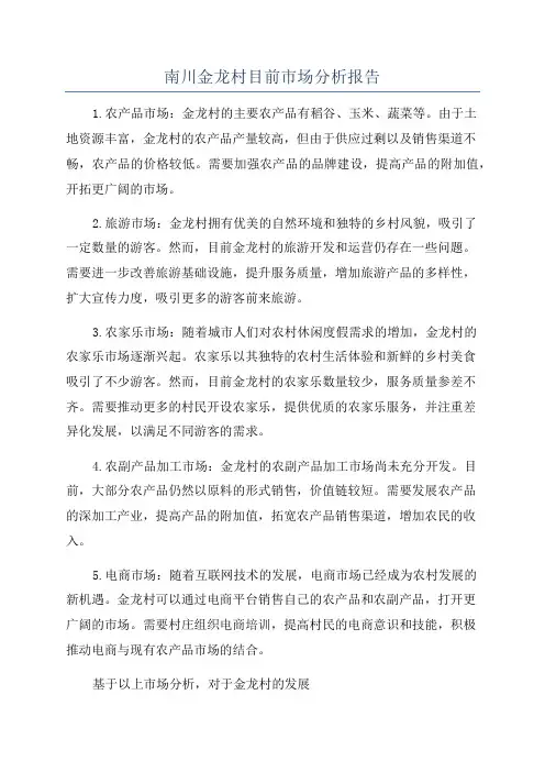 南川金龙村目前市场分析报告1.农产品市场:金龙村的主要农产品有稻谷、玉米、蔬菜等。