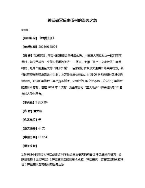 南街村的盛衰1. 村情简介南街村位于河南省临颍县城南隅,全村共848户,3180口人,1000亩耕地,总面积1.78平方公里。