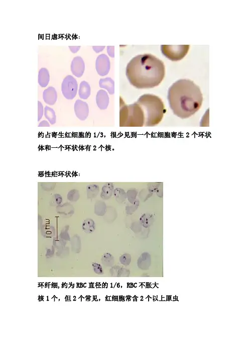 恶性疟环状体:环纤细,约为RBC直径的1/6,RBC不胀大核1个,但2个常见,红细胞常含2个以上原虫虫体不规则,较大;阿米巴样空泡明显;疟色素细小,黄褐色。