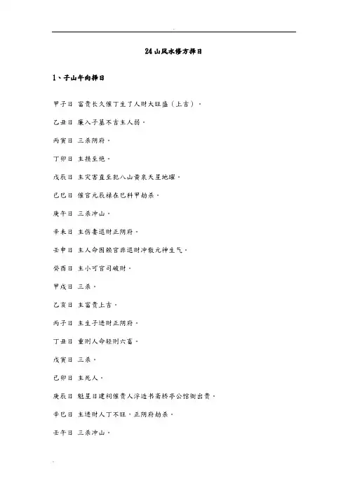 二之阳早格格创做十四山择凶天机二十四山择凶天机壬山丙背.正五止属火,其居于北圆亥子之间,死于申旺于子库为辰,单山与子共宫,三合申辰会局,壬禄到亥,子为羊刃,甲为祸德,卯巳为天乙贵人,辰为祸星贵人,丁为正财,己为正官,辛为正印.喜亥子夹辅,忌巳午暗冲.选课宜四亥、四巳、四卯、与申子辰火局.壬山丙背兼亥巳分金.分金线为:丁亥丁巳线.坐室宿二度,背翌宿三度凶.课宜:亥卯终木局、申子辰火局凶.壬山丙背兼子午分金.分金线为:辛亥辛巳线.坐二十八宿中危宿十三度背弛宿十五度凶.课宜:申子辰火局补旺山凶.巳酉丑恶金局死扶山也凶.天帝,大雪到山,芒种到背;太阳,坐秋到山,坐秋到背. 壬山躲讳-----天罡四煞:巳酉丑恶仙命忌辰年、月、日、时. 亥卯已仙命忌戌年、月、日、时. 马前炙退:巳酉丑恶年. 罗天大退:甲年. 六十年空:申寅年. 巡山罗睺:亥年. 古墓煞;子丑恶月,午亥月.甲已年:山运为甲戌火,忌日课四柱纳音火克.乙庚年:山运为丙戌土,忌日课四柱纳音木克.丙辛年:山运为戊戌木,忌日课四柱纳音金克.丁壬年:山运为庚戌金,忌日课四柱纳音火克.戊癸年:山运为壬戌火,忌日课四柱纳音土克.2.冲山 : 壬山丙背兼亥巳分金:忌巳年、月、日、时. 壬山丙背兼子午分金:忌午年、月、日、时.3.山家三煞 : 壬山(含兼针):山家座北,山家三煞正在北,忌寅午戌年、月、日、时.4.阳府 : 壬山傍阳府有二组:丁壬与乙庚.日课中如共时出现一组二搞丁壬或者乙庚齐均忌,单搞有制权用.5.山圆煞 : 忌乙卯、丁巳日,乙卯、丁巳时小忌.6.星曜煞 : 忌戊辰、戊戌、己丑恶、己终日(时).7.冲丁煞 : 壬山兼亥,忌丁巳日(时);壬山兼子,忌辛巳日(时).8.弓箭煞 : 忌子午二收齐,单收不忌.9.剑锋煞 : 忌亥月.10.日流太岁 : 忌戊子旬克山日(即忌采用搞收纳音克山运的日子).11.文直煞 : 兼亥,忌甲子旬的空亡日;兼子,忌甲寅旬的空亡的日.12.天天燥火 : 天燥火忌寅申时,天燥火忌巳亥时.壬山制葬流年凶凶定局甲子年:利.忌启山坐背,犯浮天空亡.乙丑恶年:不利.犯傍阳府.有制权用.丙寅年:不利.犯三煞.丁卯年:不利.犯傍阳府.有制权用.戊辰年:不利.犯阳八煞.己巳年:利.庚午年:不利.犯三煞,傍阳府.辛终年:大利.壬申年:不利.犯傍阳府.葵酉年:利.甲戌年:不利.犯三煞,浮天空亡.乙亥年:不利.犯傍阳府,巡山罗喉.有制权用.丙子年:利.忌刀砧煞.丁丑恶年:不利.犯傍阳府.戊寅年:不利.犯三煞,年克.已卯年:利.庚辰年:不利.犯傍阳府.有制权用.辛巳年:利.壬午年:不利.犯三煞,傍阳府.癸已年:大利.甲申年:权用.犯年克.乙酉年:不利.犯傍阳府.有制权用.丙戌年:不利.犯三煞,刀砧煞.丁亥年:不利.犯傍阳府,巡山罗喉.戊子年:利.忌刀砧煞.已丑恶年:不利.犯阳八煞.庚寅年:不利.犯三煞,傍阳府,年克. 辛卯年:大利.壬辰年:不利.犯傍阳府.癸巳年:大利.甲午年:不利.犯三煞,浮天空亡.乙已年:不利.犯傍阳府.丙申年:利.忌血刃.丁酉年:不利.犯傍阳府,年克.戊戌年:不利.犯阳八煞,三煞,刀砧煞.已亥年:利.忌坐背,犯巡山罗喉.庚子年:不利.犯傍阳府.辛丑恶年:利壬寅年:不利.犯三煞,傍阳府.癸卯年:大利.甲辰年:利.忌启山坐背,犯浮天空亡. 乙巳年:不利.犯傍阳府,血刃.丙午年:不利.犯三煞.丁已年:不利.犯傍阳府.戊申年:利.已酉年:利庚戌年:不利.犯三煞.辛亥年:利.忌刀砧煞.壬子年:不利.犯傍阳府.癸丑恶年:利.甲寅年:不利.犯三煞,年克,浮天空亡. 乙卯年:不利.犯傍阳府.丙辰年:利.丁巳年:不利.犯傍阳府.戊午年:不利.犯三煞.已已年:不利.犯阳八煞.庚申年:不利.犯傍阳府.辛酉年:利.壬戌年:不利.犯三煞,傍阳府.癸亥年:大利.壬山建筑流月凶凶与凶日定局正月凶犯山家三煞.二月凶甲申、戊申、己亥、辛亥、辛丑恶、癸丑恶、辛终、癸终.三月凶丙子、甲申、丙申、己巳、癸巳.四月凶丙子、已卯、辛卯、癸卯、癸丑恶.五月凶犯山家三煞.六月凶甲申、丙申、辛亥、辛终.七月凶丙子、辛终、甲申、丙申.八月凶己巳、辛巳、葵丑恶、甲辰、丙辰、壬辰.九月凶犯山家三煞.十月凶丙子、壬子、辛终、癸终、己酉、辛酉、癸酉. 十一月凶甲辰、丙辰、甲申、丙申、辛丑恶、癸丑恶、己亥、辛亥、癸终.十二月凶己巳、癸巳、甲申、丙申、戊申、丁亥、辛亥. 注:1.选日只论节气,不管月份;2.以上表中凶日为粗选之日,除表中定局凶日中的其余凶日均要思量制煞及其余果素概括采用.3.每遇土符、土府、天囊,忌动土.壬山埋葬流月凶凶与凶日定局正月凶犯山家三煞.二月凶甲申、戊申、丙申、癸巳、辛终、癸终.三月凶甲申、丙申、丙子、辛酉、癸酉.四月凶癸卯、甲辰、已酉、癸酉、辛丑恶、癸丑恶、已卯、辛卯.五月凶犯山家三煞.六月凶甲申、丙申、辛卯、癸卯、辛酉、癸酉.七月凶丙申、戊申、丙子、已酉、辛酉、癸酉、丙辰、甲辰.八月凶甲申、丙申、甲辰、丙辰、癸丑恶、己酉 .九月凶犯山家三煞.十月凶犯剑锋煞十一月凶甲申、甲辰、丙辰、辛卯、癸卯、辛酉、癸酉、辛亥、癸终.十二月凶甲申、丙申、辛酉、癸酉、丙子、辛卯、癸卯.注:1.选日只论节气,不管月份;2.以上表中凶日为粗选之日,除表中定局凶日中的其余凶日均要思量制煞及其余果素概括采用.3.遇十二建星中启日忌埋葬,但是不忌破土.杨公风火坐背择日大凶时甲已日、凶时:子、丑恶、午、已、酉、戌时大凶大利.乙庚日、凶时:子、巳、午、申、酉时大凶大利.丙辛日