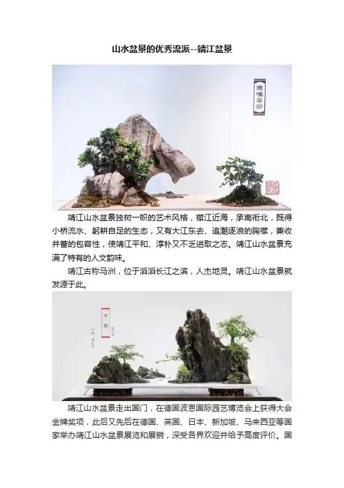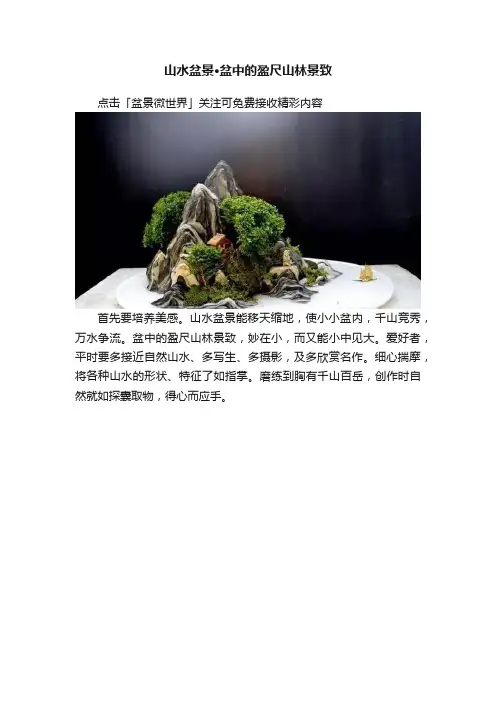 山水盆景介绍范文山水盆景是中国古代艺术的一种形式,是在小巧的容器中创造出山水景观的一种表现艺术。