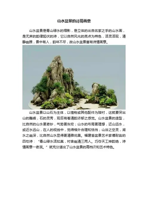 山水盆景的诗情画意山水盆景是青山绿水的缩影,是立体的出自名家之手的山水画,是无声的韵律起伏的诗,它以自然风光的亮点为特色,活灵活现,清静幽雅,景中有人,韵味不尽,故山水盆景富有诗情画意。