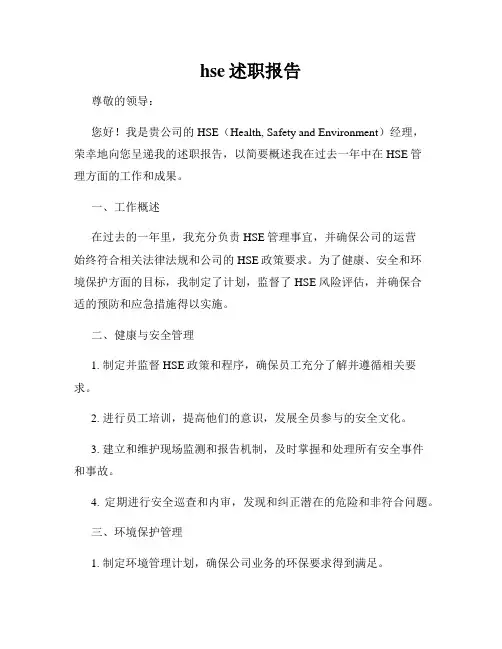 hse述职报告尊敬的领导:您好!我是贵公司的HSE(Health, Safety and Environment)经理,荣幸地向您呈递我的述职报告,以简要概述我在过去一年中在HSE管理方面的工作和成果。