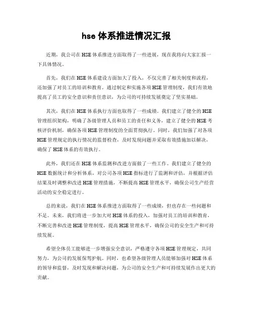 自从2003年9月份开始实行HSE 管理体系试运行以来,在试运行过程中,我们坚持把HSE管理理念贯穿到日常安全、数质量、特别是现场管理工作中,并取得了一定的成效,下面就建立和实施HSE管理体系情况汇报如下,请予审核:一、领导重视是建立HSE管理体系的前提和关键开展HSE工作,离不开领导的重视和参与,需要提供必要的人力、物力和财力,为开展HSE工作创造良好的条件。