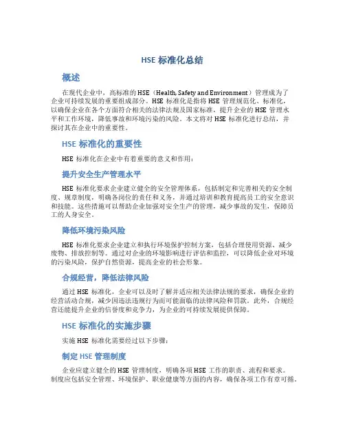 以下是对2024年HSE标准化管理运用的总结:1. 法规合规:企业更加重视HSE法规的遵守和实施,将其纳入到日常运营的各个层面。