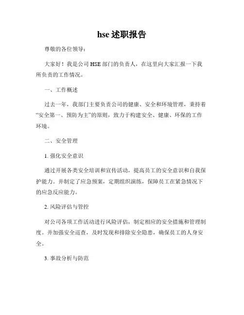 二、工作概述过去一年,我所负责的HSE工作涵盖了多个领域,如事故预防、职业健康、环境保护等。