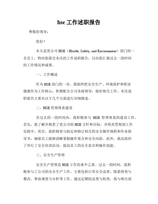 hse工作述职报告尊敬的领导:您好!本人是贵公司HSE(Health, Safety, and Environment)部门的一名员工,特向您提交本次的工作述职报告,以向您汇报过去一段时间的工作情况和成果。
