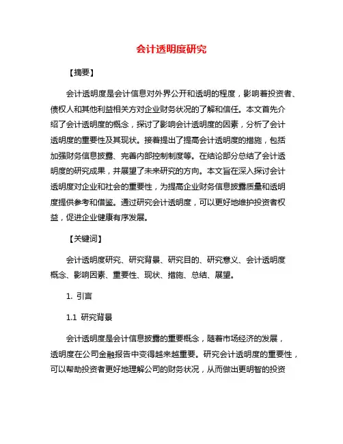 1.2 研究目的本文旨在探讨会计透明度的重要性以及影响会计透明度的因素,以期为提高企业财务信息披露的透明度提供理论依据和实践指导。