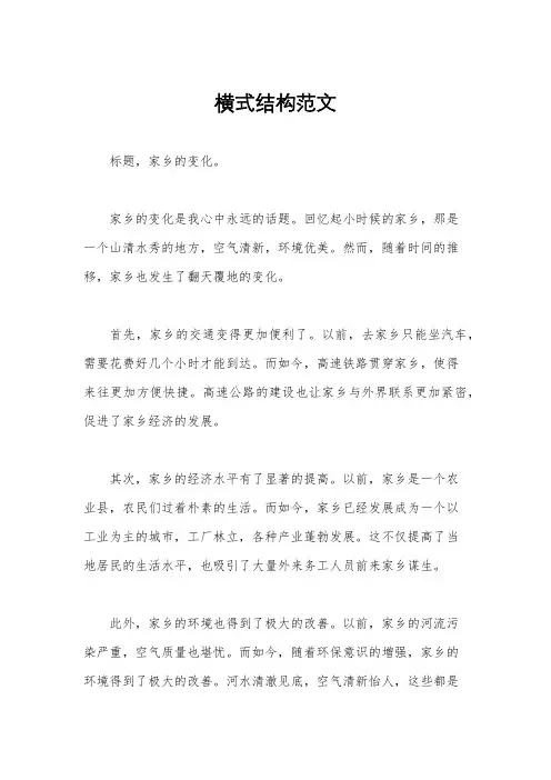 作文的横式结构作者:赵华来源:《作文周刊·高二版》2011年第49期笔者从考场作文的实际需要出发,着重围绕作文的横式结构给大家介绍几种关于写作记叙文和议论文的常用结构技法。