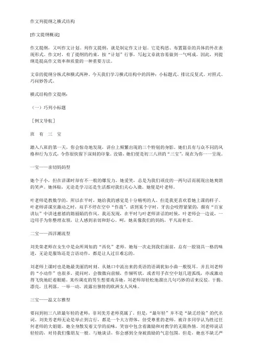 一.横式结构作文:1、巧列小标题横式结构中最简单的一种是使用小标题,即文章的第二部分的写作内容以小标题的形式呈现出来,把一组属于不同类别,但有内在联系的事物或景象,按照差不多相同的句子结构排列在一起,来共同表达一个主题。