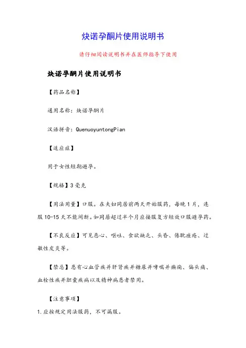 二、避孕药的使用方法1、复方炔诺酮、复方甲地孕酮,为低剂量雌激素的单相短效口服避孕药。
