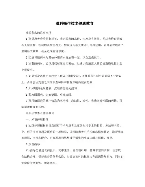 3. 针对性和实用性- 根据患者具体情况,制定针对性的教育方案;- 注重实际操作技能的传授,如正确的眼部清洁方法、用药方法等;- 注重教育内容的实用性和可操作性,使患者能够真正受益。