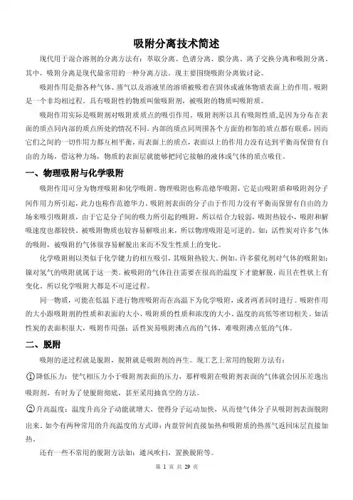 吸附分离技术简述现代用于混合溶剂的分离方法有:萃取分离、色谱分离、膜分离、离子交换分离和吸附分离。