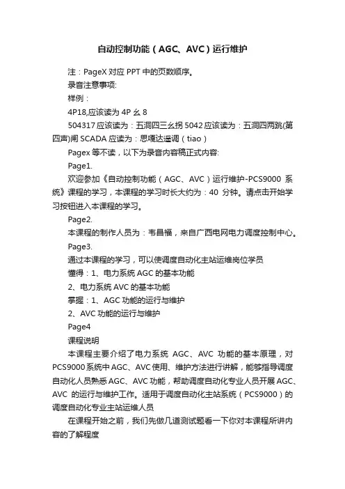 录音注意事项:样例:4P18,应该读为4P幺8504317应该读为:五洞四三幺拐5042应该读为:五洞四两跳(第四声)闸SCADA应读为:思嘎达遥调(tiao)Pagex等不读,以下为录音内容稿正式内容:Page1.欢迎参加《自动控制功能(AGC、AVC)运行维护-PCS9000系统》课程的学习,本课程的学习时长大约为:40分钟。