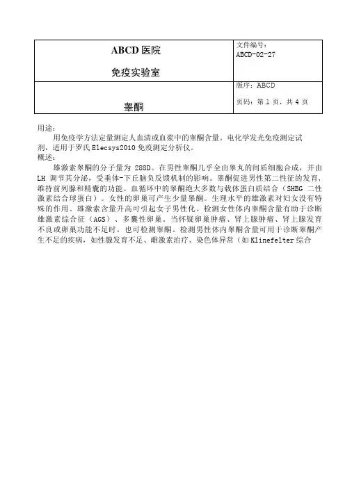 睾酮Testo测定标准操作规程1 检验目的规范本实验室的检验操作,确保睾酮(Testo)检测结果及报告的准确性、可靠性和有效性。