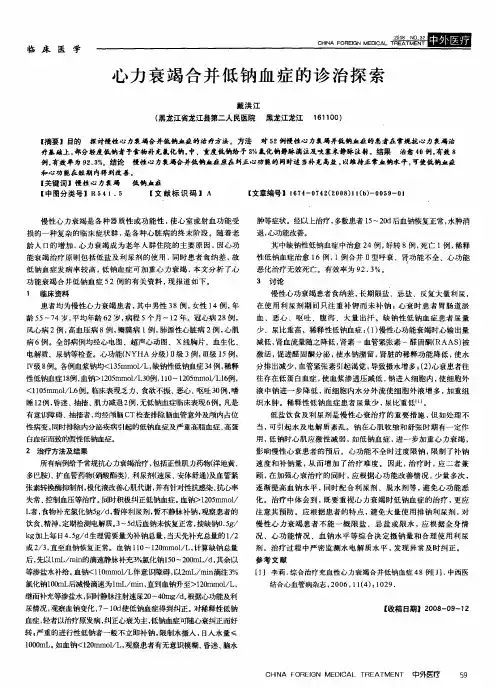 二、合并低钠血症的危害1. 加重心衰症状:低钠血症会导致水肿加重,心脏负荷加大,从而使心衰症状加重。