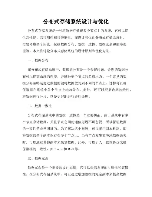 二、分布式存储系统的优化方法1. 动态数据分布策略动态数据分布策略是分布式存储系统设计中的一项关键优化技术。
