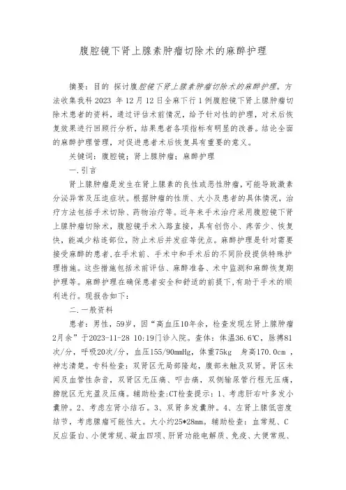 关键词:腹腔镜;肾上腺肿瘤;麻醉护理一.引言肾上腺肿瘤是发生在肾上腺素的良性或恶性肿瘤,可能导致激素分泌异常及压迫症状。