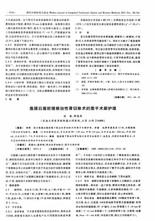 腹腔镜下肾切除患者的围手术期护理【摘要】随着科技的进步,县级医院泌尿外科也逐渐向微创方向发展,经腹腔镜下的肾切除术是微创术在泌尿外科一大进步的体现,它具有创口小、康复快、并发症相对少,病人痛苦小等优点,但是也存在着一定的风险。