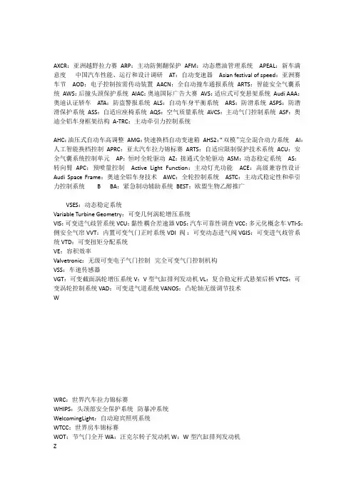 AXCR:亚洲越野拉力赛ARP:主动防侧翻保护AFM:动态燃油管理系统APEAL:新车满意度中国汽车性能、运行和设计调研AT:自动变速器Asian festival of speed:亚洲赛车节AOD:电子控制按需传动装置AACN:全自动撞车通报系统ARTS:智能安全气囊系统AWS:后撞头颈保护系统AIAC:奥迪国际广告大赛AVS:适应式可变悬架系统Audi AAA:奥迪认证轿车ATA:防盗警报系统ALS:自动车身平衡系统ARS:防滑系统ASPS:防潜滑保护系统ASS:自适应座椅系统AQS:空气质量系统AVCS:主动气门控制系统ASF:奥迪全铝车身框架结构A-TRC:主动牵引力控制系统AHC:油压式自动车高调整AMG:快速换档自动变速箱AHS2:“双模”完全混合动力系统AI:人工智能换档控制APRC:亚太汽车拉力锦标赛ARTS:自适应限制保护技术系统ACU:安全气囊系统控制单元AP:恒时全轮驱动AZ:接通式全轮驱动ASM:动态稳定系统AS:转向臂APC:预喷量控制Active Light Function:主动灯光功能ACE:高级兼容性设计Audi Space Frame:奥迪全铝车身技术AWC:全轮控制系统ASTC:主动式稳定性和牵引力控制系统 B BA:紧急制动辅助系统BEST:欧盟生物乙醇推广VSES:动态稳定系统Variable Turbine Geometry:可变几何涡轮增压系统VIS:可变进气歧管系统 VCU:黏性耦合差速器 VDS:汽车可靠性调查 VCC:多元化概念车 VTI-S:侧安全气帘 VVT:内置可变气门正时系统 VDI阀:可变动态进气阀 VGIS:可变进气歧管系统 VTD:可变扭矩分配系统VE:容积效率Valvetronic:无级可变电子气门控制完全可变气门控制机构VSS:车速传感器VGT:可变截面涡轮增压系统 V:V型气缸排列发动机 VL:复合稳定杆式悬架后桥 VTCS:可变涡轮控制系统 VAD:可变进气道系统 VANOS:凸轮轴无级调节技术WWRC:世界汽车拉力锦标赛WHIPS:头颈部安全保护系统防暴冲系统WelcomingLight:自动迎宾照明系统WTCC:世界房车锦标赛WOT:节气门全开 WA:汪克尔转子发动机 W:W型汽缸排列发动机ZZBC:笼型车体概念 ZEV:零废气排放数字4WD:四轮驱动 4C:四区域独立可调空调4WS:四轮转向 4MATIC:全轮驱动系统4HLC:高速四轮驱动配中央差速器4H:高速四驱 4L:低速四驱 4LC:低速锁止四驱。